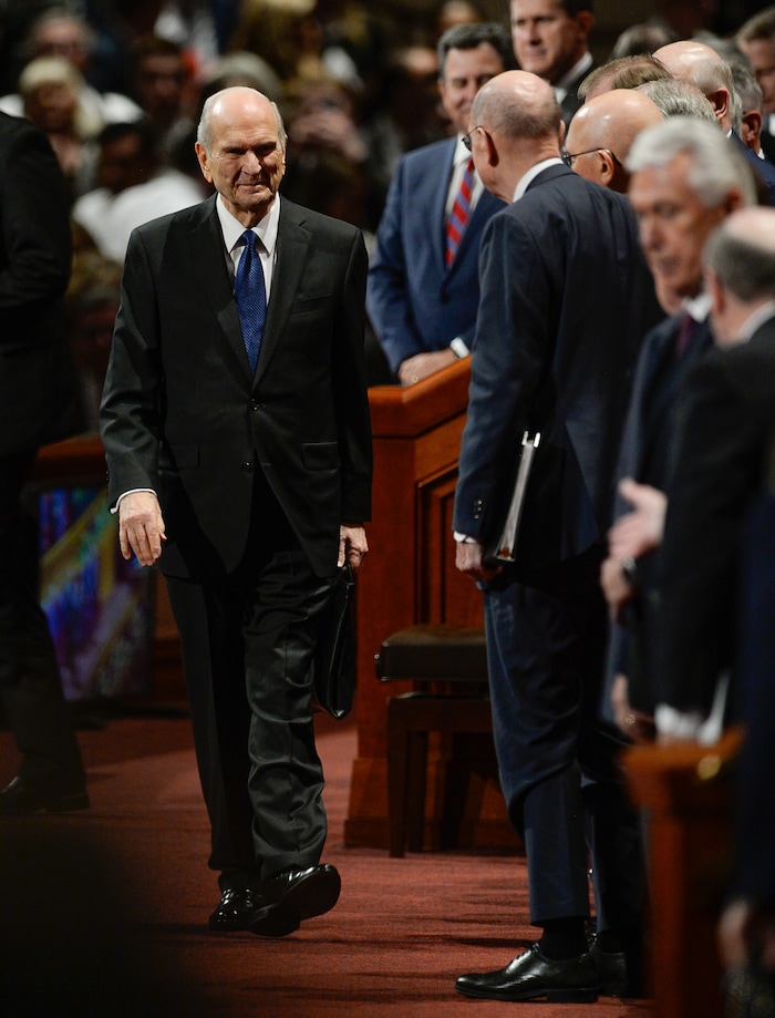 (Francisco Kjolseth | The Salt Lake Tribune) President Russell M. Nelson, center, greets M. Russell Ballard, acting president of the Quorum of the Twelve Apostles, while followed by President Dallin H. Oaks, first counselor in the First Presidency, and Henry B. Eyring, second counselor in the First Presidency, for the start of the Sunday afternoon session of the 189th Semiannual General Conference of The Church of Jesus Christ of Latter-day Saints at the Conference Center in Salt Lake City on Sunday, Oct. 6, 2019.