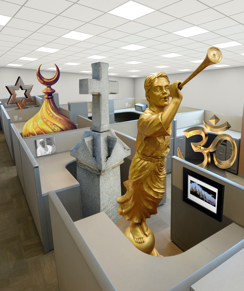 Employees are free to festoon their desks with a star of David, a Buddha, a crucifix, an Angel Moroni, a statue of Ganesh, a gilded scripture saying and any other religious symbol of their choose.