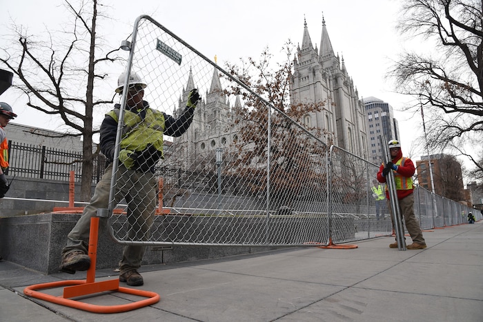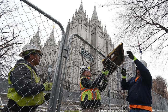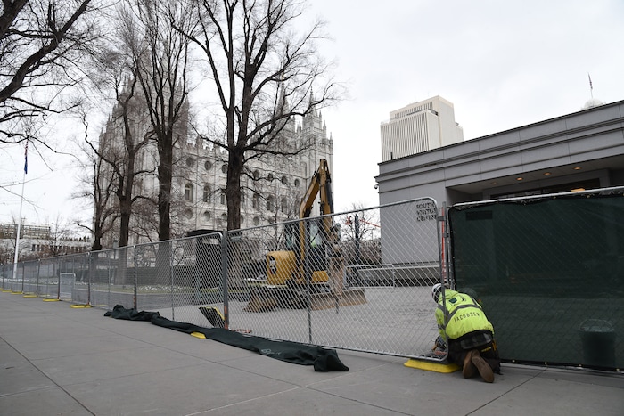 (Francisco Kjolseth | The Salt Lake Tribune) Crews begin to prepare the grounds for the 4-year renovation of the Salt Lake Temple and Temple Square on Thursday, Jan. 2, 2020.