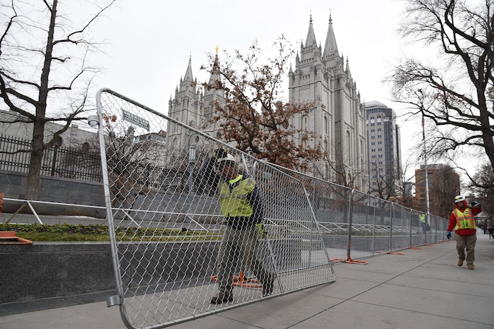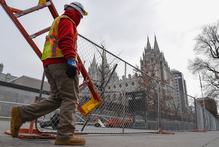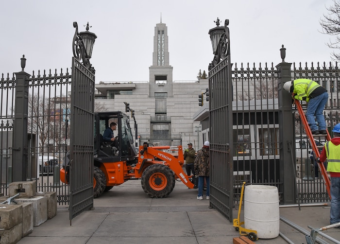(Francisco Kjolseth | The Salt Lake Tribune) Crews begin to prepare the grounds for the 4-year renovation of the Salt Lake Temple and Temple Square on Thursday, Jan. 2, 201920.