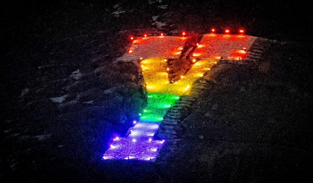 One year after the original Honor Code wording change, dozens of students hiked to the mountainside Y and lit it up in LGBTQ-friendly rainbow colors against the night sky.