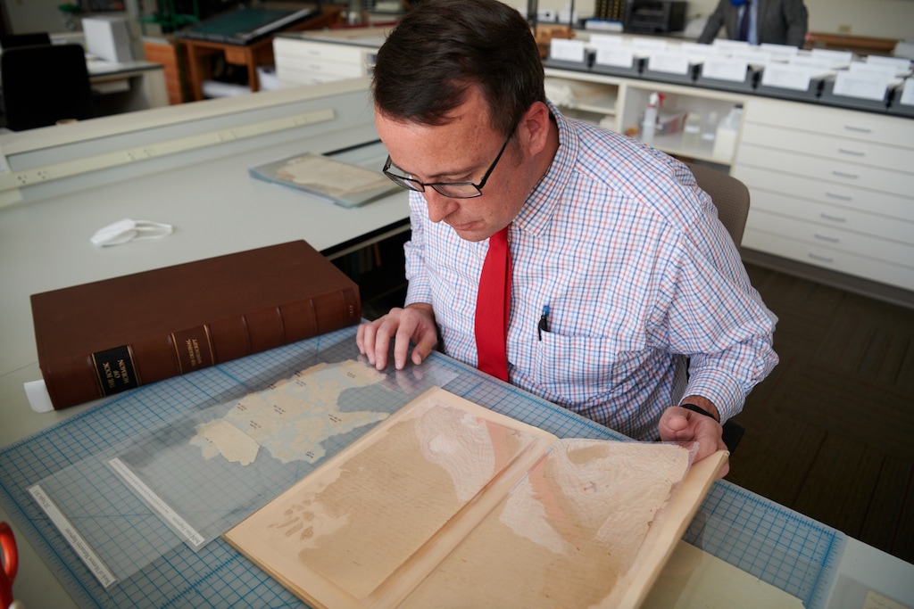 (The Church of Jesus Christ of Latter-day Saints) Robin Scott Jensen, co-editor of a new volume of the Joseph Smith Papers that focuses on the original manuscript of the Book of Mormon, holds a page from the original manuscript in the Church History Library on Jan. 19, 2022.
