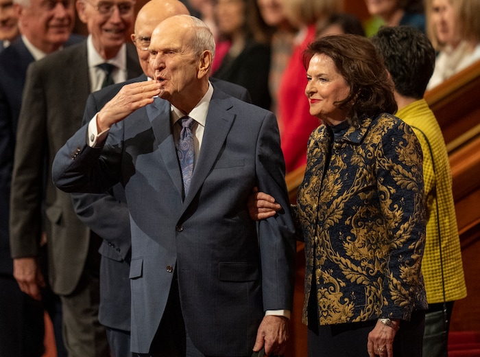 (Rick Egan | The Salt Lake Tribune) President Russell M. Nelson waves to the audience with his wife, Wendy, after the morning session of LDS General Conference on Saturday, April 2, 2022.