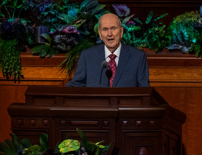 (Rick Egan | The Salt Lake Tribune) President Russel M. Nelson delivers his opening remarks in the morning session of LDS General Conference on Saturday, April 2, 2022.