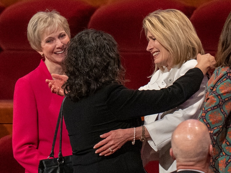 (Rick Egan | The Salt Lake Tribune) Jean Bingham and Reyna Aburto hug the incoming Relief Society general President Camille N. Johnson after the afternoon session of LDS General Conference on Saturday, April 2, 2022.