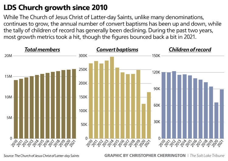 Many members delayed baby blessings in 2020 and, to a lesser extent, last year — since Sunday services halted and then took place only remotely for long stretches of time — so fewer children were added to the faith’s rolls.