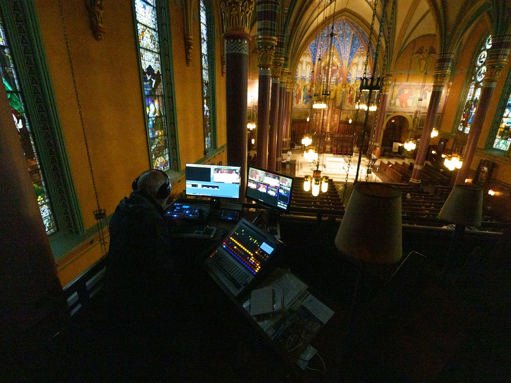 (Leah Hogsten | The Salt Lake Tribune) One of six cameras is used to broadcast the Cathedral of the Madeleine's morning Mass on March 31, 2022.