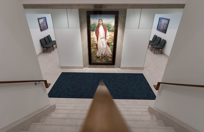 (Francisco Kjolseth | The Salt Lake Tribune) A foyer in the new 95 State meetinghouse of The Church of Jesus Christ of Latter-day Saints on Friday, April 8, 2022.