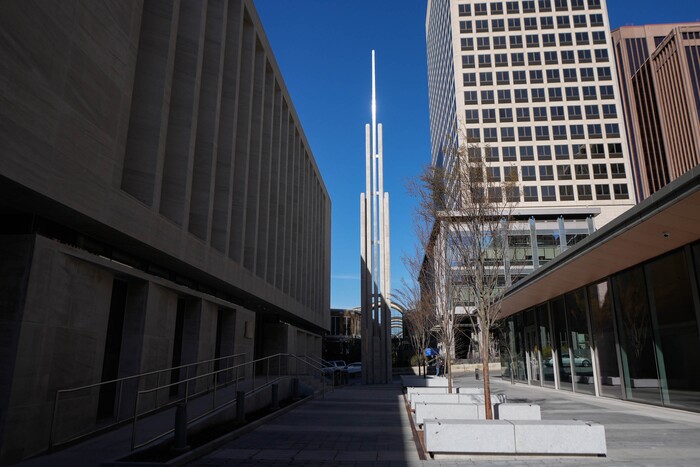 (Francisco Kjolseth | The Salt Lake Tribune) A steeple rises in downtown Salt Lake City at 95 State, the new meetinghouse of The Church of Jesus Christ of Latter-day Saints as seen on Friday, April 8, 2022.