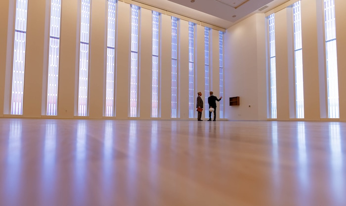 (Francisco Kjolseth | The Salt Lake Tribune) People tour the main chapel in the new 95 State meetinghouse of The Church of Jesus Christ of Latter-day Saints on Friday, April 8, 2022, where light filters through 100,000 pieces of glass that were laminated together.