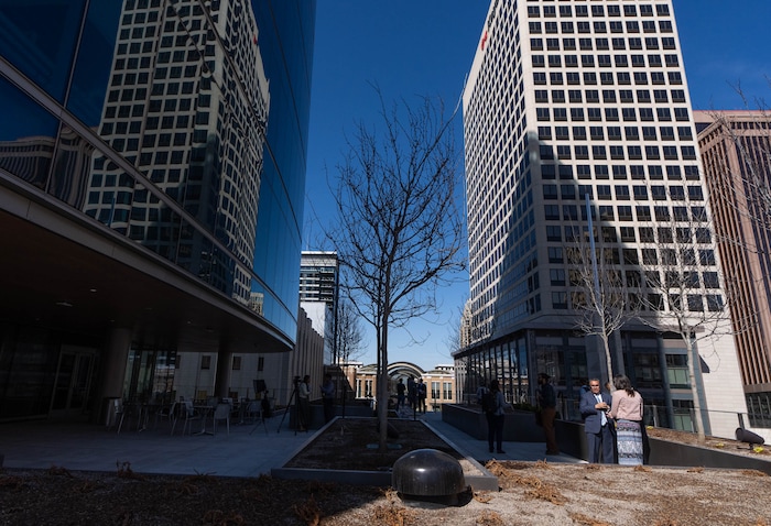 (Francisco Kjolseth | The Salt Lake Tribune) Media tour the terrace on the fifth floor of the new 95 State meetinghouse of The Church of Jesus Christ of Latter-day Saints on Friday, April 8, 2022.