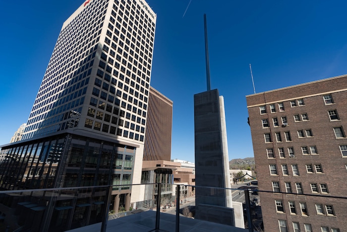 (Francisco Kjolseth | The Salt Lake Tribune) A new steeple at 95 State marks a new meetinghouse of The Church of Jesus Christ of Latter-day Saints as seen on Friday, April 8, 2022. The 39,000-square-foot, four-story meetinghouse includes two chapels and was built into the adjacent high-rise in downtown Salt Lake City.
