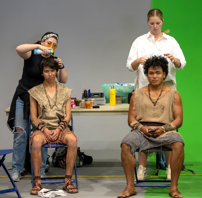 (Rick Egan | The Salt Lake Tribune) Hairdressers work on a couple of stripling warriors before filming scenes for the Book of Mormon Videos on Friday, June 17, 2022.