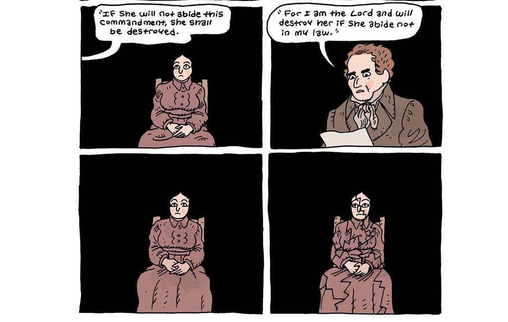 One another page, Joseph reads Emma a revelation in which God says she’ll be “destroyed” if she doesn’t accept polygamy. For one panel, she only sits and stares. In the next, cracks appear all over her body.