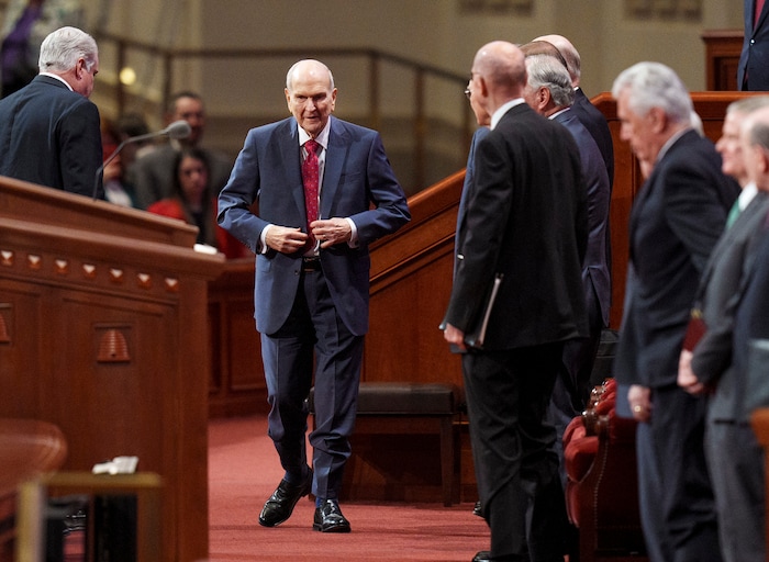(Leah Hogsten | The Salt Lake Tribune) Russell M. Nelson, 98, shown leaving the morning session of General Conference on Saturday, April 1, 2023, is the oldest prophet-president in the The Church of Jesus Christ of Latter-day Saints' 193-year history.