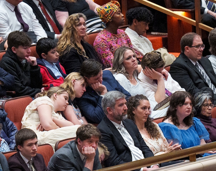 (Leah Hogsten | The Salt Lake Tribune) Members of The Church of Jesus Christ of Latter-day Saints listen to speakers during the morning session of General Conference on Saturday, April 1, 2023.