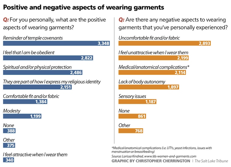 For Kindred, who wore garments for two decades, the results of the survey “indicate that the struggles Mormon women have expressed online about their garments are widespread, not coming from a fringe group.… Some women [like the example above] felt that wearing garments was a physical sacrifice that brought them closer to God, while other women stated that God doesn’t care what underwear you wear.”