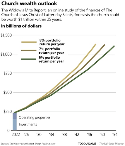 So, without a significant change in how the church uses its investments — and assuming overall market returns similar to past years — Widow’s Mite forecasts the 17 million-member church will be worth $500 billion in 11 to 15 years and $1 trillion within 21 to 27 years.