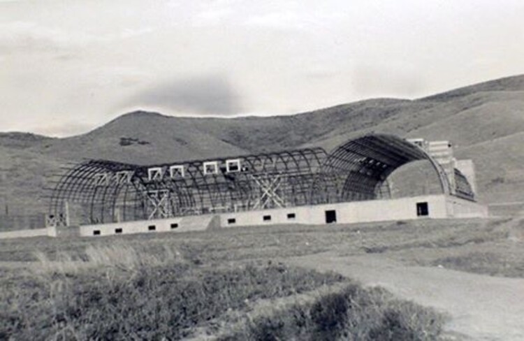 (Huntsville monastery archives) The Quonset hut abbey under construction in 1948.