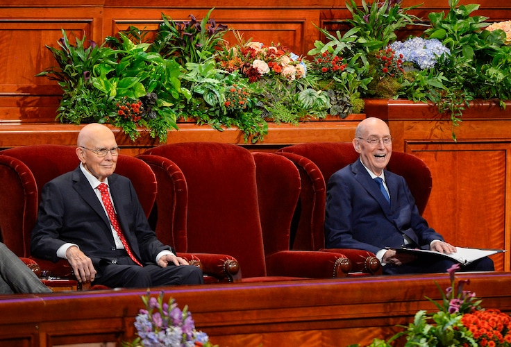 (Chris Samuels | The Salt Lake Tribune) Dallin H. Oaks, first counselor in the First Presidency, left, and Henry B. Eyring, second counselor, are seated before the start of General Conference on Saturday, Sept. 30, 2023. Church President Russell M. Nelson, who usually sits in the middle, was not present for the conference because of health.