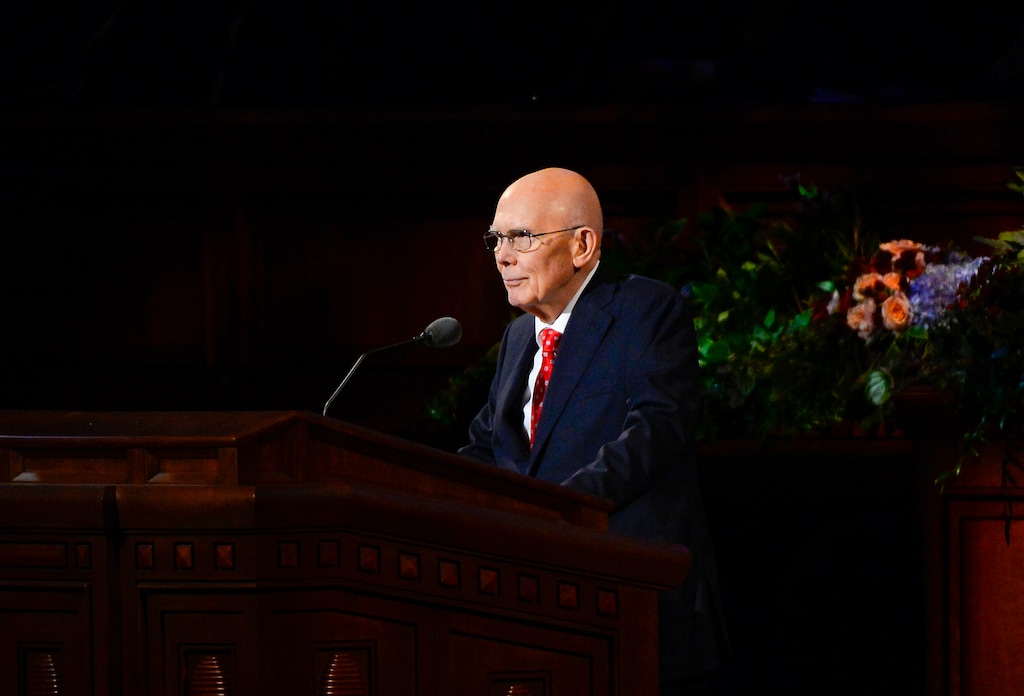 President Dallin H. Oaks, Nelson’s 91-year-old counselor in the three-member governing First Presidency and next in line to lead the church, presided in person at the Conference Center in downtown Salt Lake City and gave the morning session’s concluding speech.