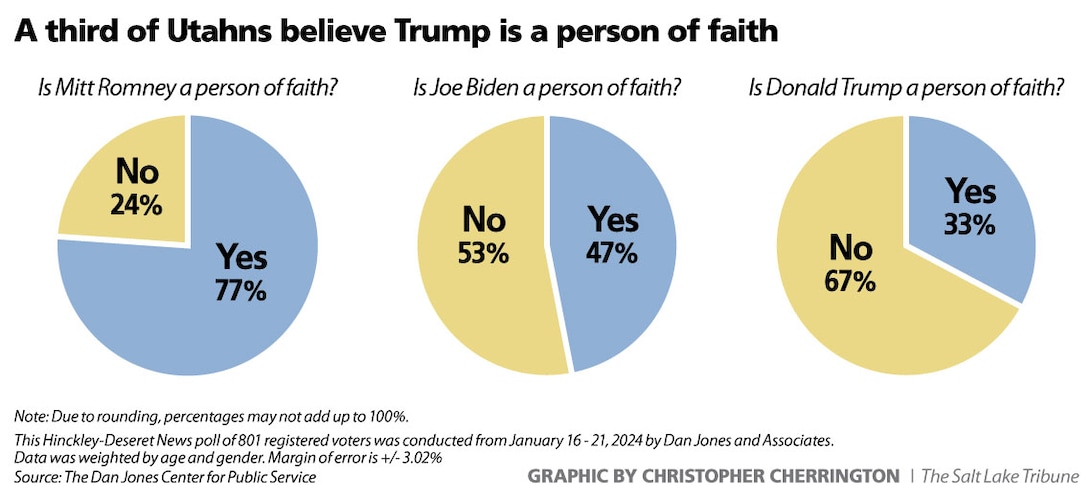 A Deseret News-Hinckley Institute of Politics poll of 801 registered voters shows 47% of respondents view Biden as a person of faith, compared with 33% for Trump.