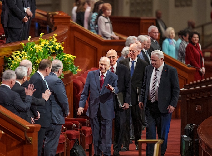 (Leah Hogsten | The Salt Lake Tribune) Members of the First Presidency of The Church of Jesus Christ of Latter-day Saints, center, President Russell M. Nelson, waving, Dallin H. Oaks and Henry B. Eyring, arrive for the spring General Conference in 2023.