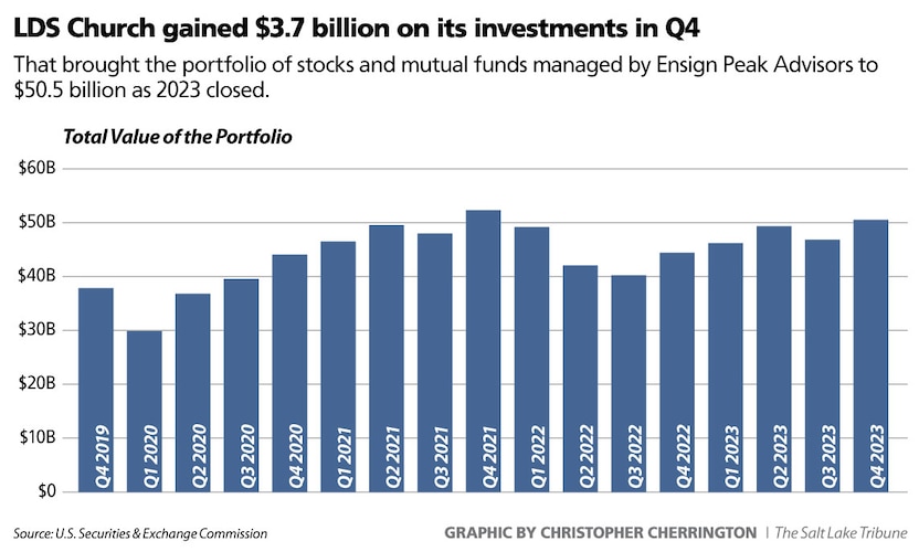New reports this week from the global faith’s investment arm, Salt Lake City-based Ensign Peak Advisors, show its portfolio of stocks, mutual funds and others investments was worth $50.5 billion, just $2 billion short of a four-year high.