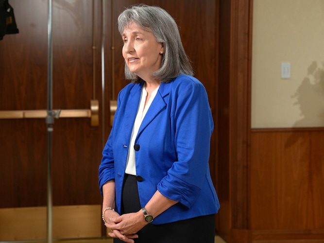 (The Church of Jesus Christ of Latter-day Saints) J. Anette Dennis, first counselor in the Relief Society General Presidency, speaks during the filming of a worldwide Relief Society devotional in the Relief Society Building in Salt Lake City on Thursday, Feb. 1, 2024. The devotional was broadcast Sunday, March 17, 2024. Her talk is getting pushback.