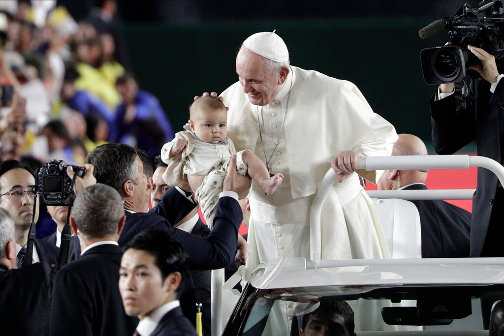 The pope urged governments to implement family-centered policies such as helping mothers negotiate work and childbirth without feeling like they have to choose between the two, helping young people escape job insecurity or aiding young couples in buying a house.