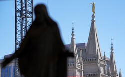 (Rick Egan | The Salt Lake Tribune) Colette Jaussi observes the Christus statue with sons Cameron and Cayson during the morning session of General Conference at the Conference Center on Saturday, April 5, 2025.