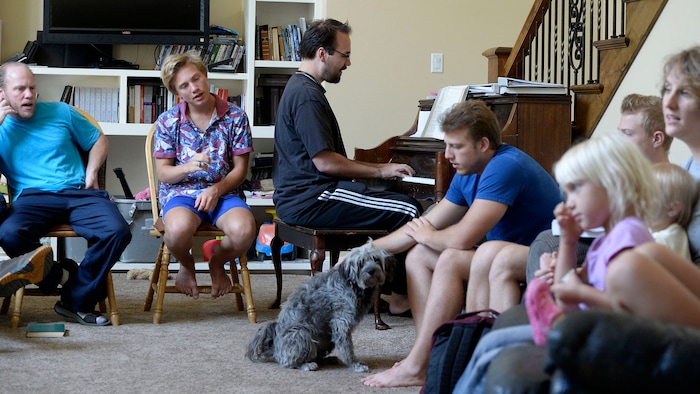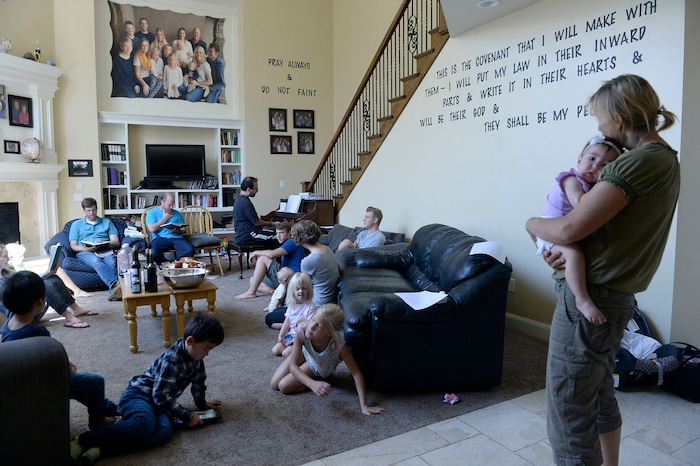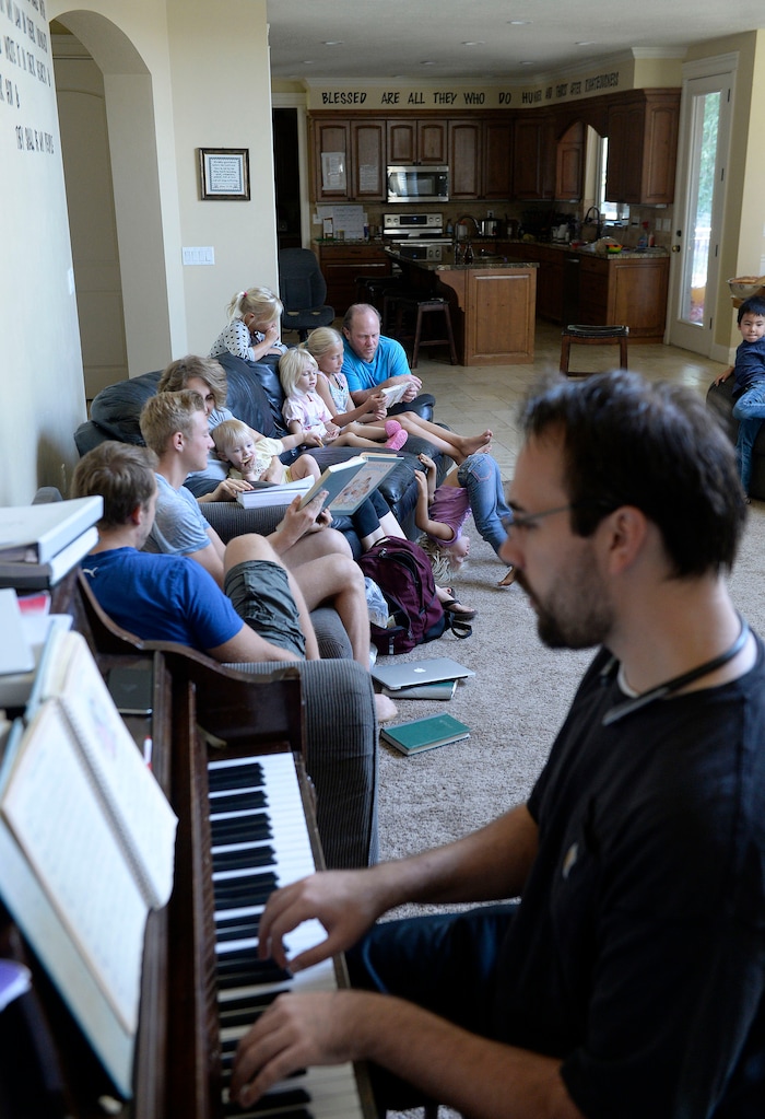 The bearded dad, a father of 11 who was excommunicated from the LDS Church in 2015 for apostasy, suggests they sing hymns, beginning with children’s pieces. So Taylor Child moves to a piano and plays “Jesus Wants Me for a Sunbeam.” After that, it’s the Mormon classic “I Am a Child of God” and “Jesus Once Was a Little Child.”