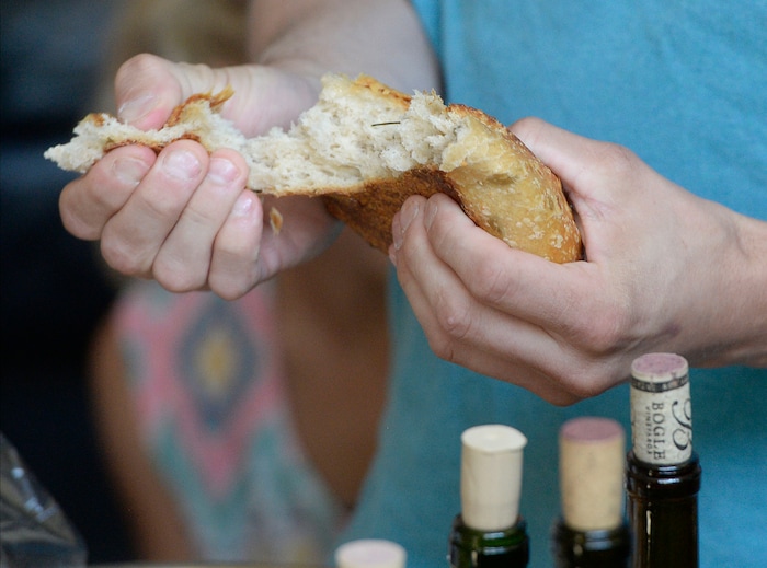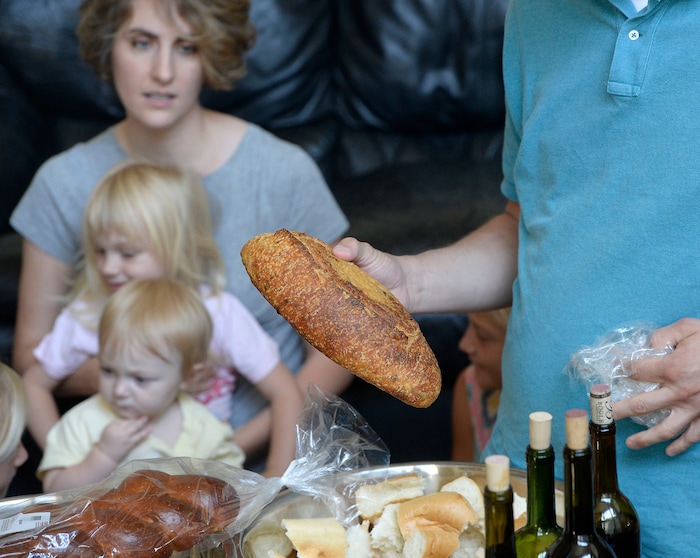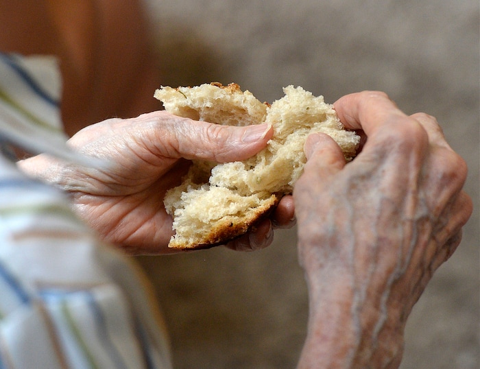 Child offers traditional Mormon communion prayers, except saying “wine” rather than water — as modern Latter-day Saints do. He and others tear slabs of the bread. Each worshipper takes a hunk. The wine and grape juice are poured into plastic cups and served.