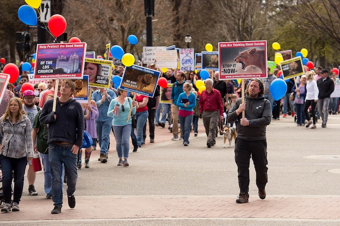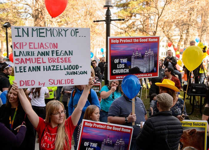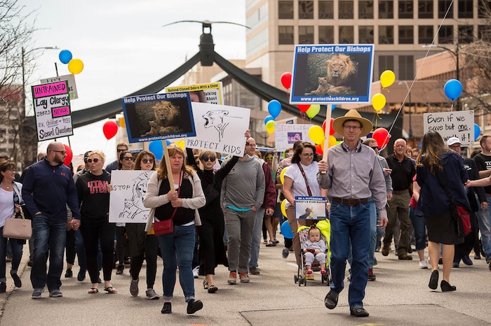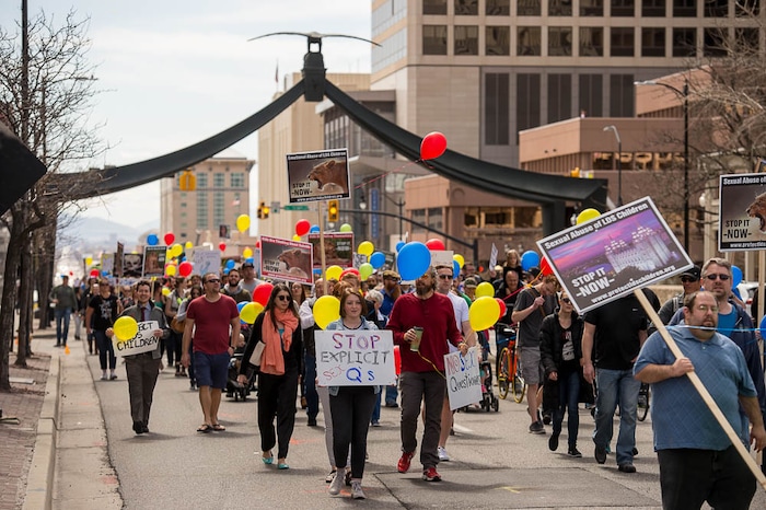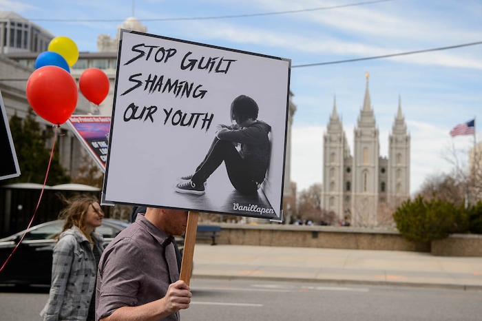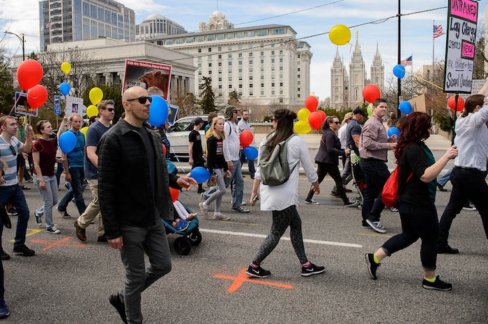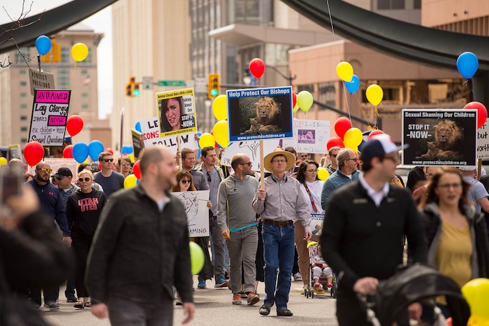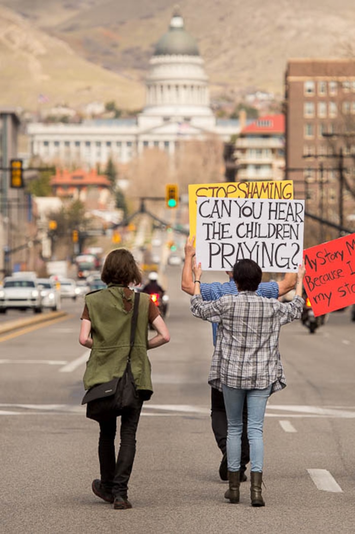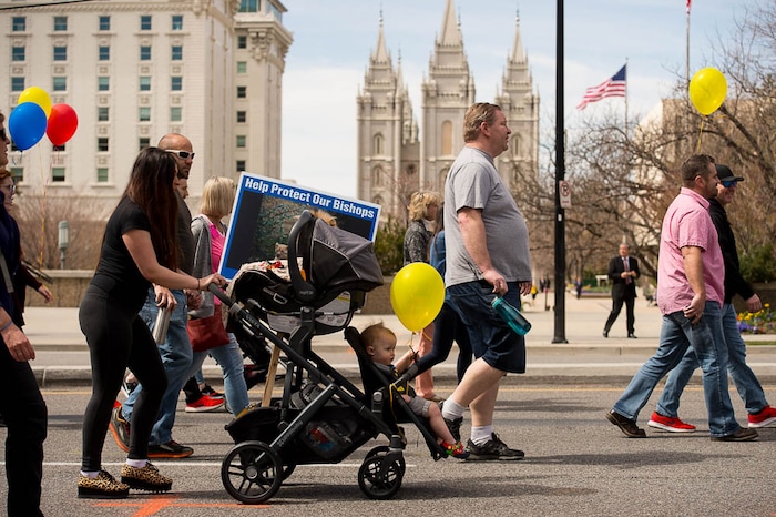 People, including members of the Mormon Church, held a rally and marched to the LDS Church Office Building in Salt Lake City to request that the faith's leaders put an end to bishops meeting one-on-one with children for interviews. Friday March 30, 2018.
