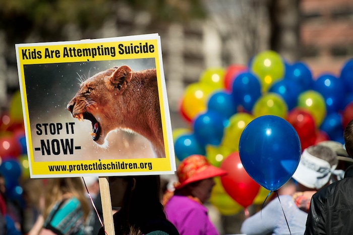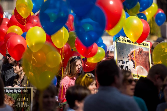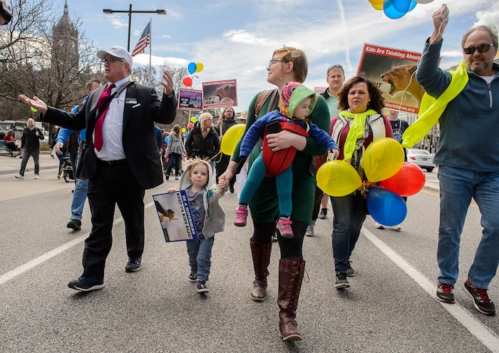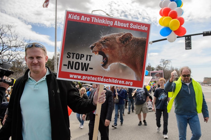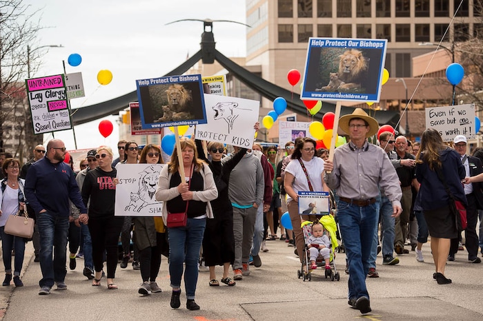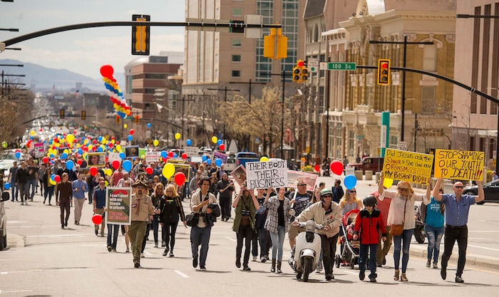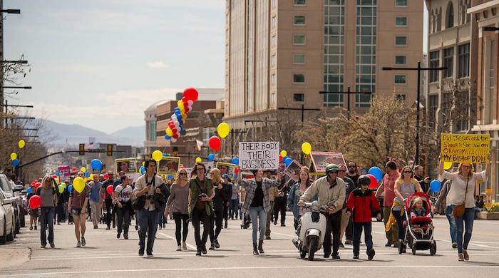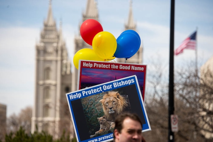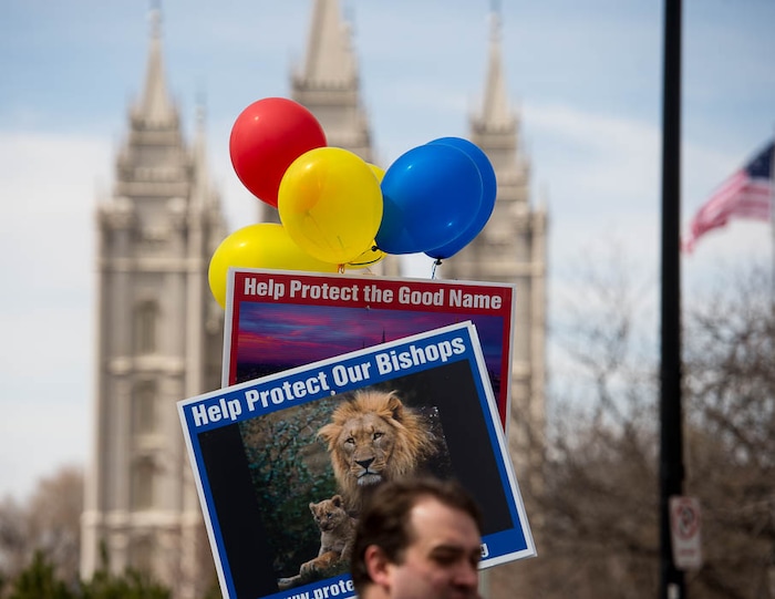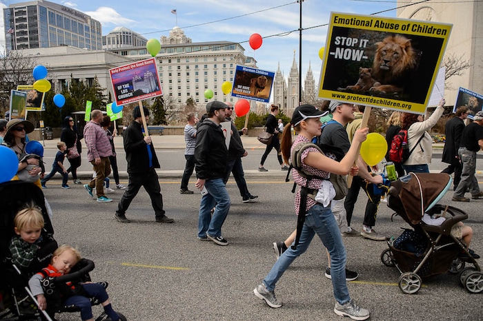 People, including members of the Mormon Church, held a rally and marched to the LDS Church Office Building in Salt Lake City to request that the faith's leaders put an end to bishops meeting one-on-one with children for interviews. Friday March 30, 2018.