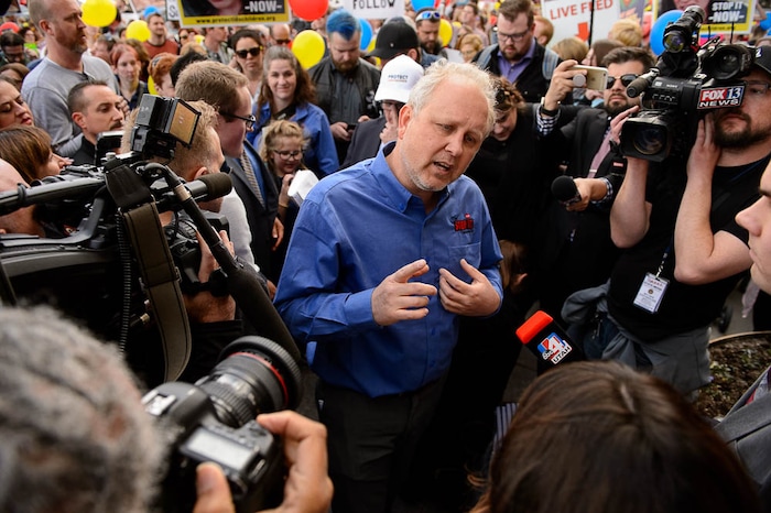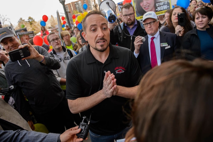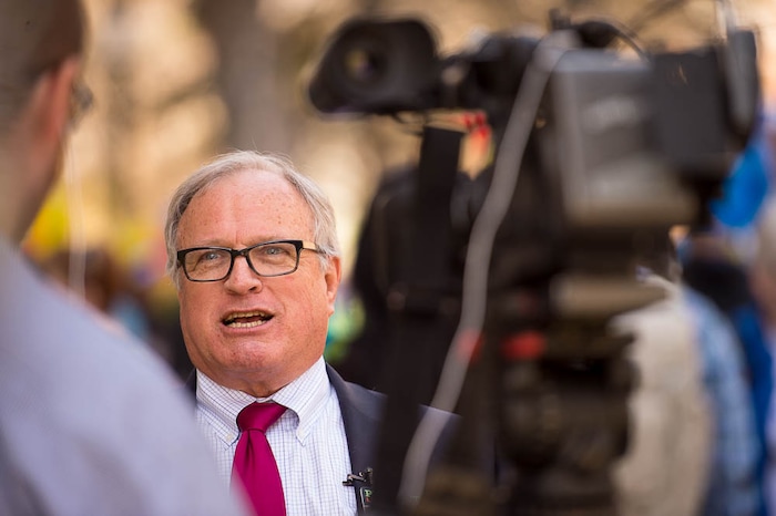 People, including members of the Mormon Church, held a rally and marched to the LDS Church Office Building in Salt Lake City to request that the faith's leaders put an end to bishops meeting one-on-one with children for interviews. Friday March 30, 2018. Sam Young, the event organizer, speaks to media.
