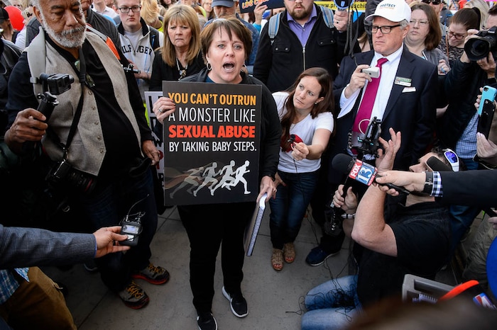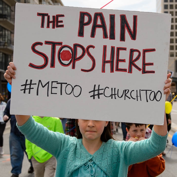 People, including members of the Mormon Church, held a rally and marched to the LDS Church Office Building in Salt Lake City to request that the faith's leaders put an end to bishops meeting one-on-one with children for interviews. Friday March 30, 2018. Sam Young.