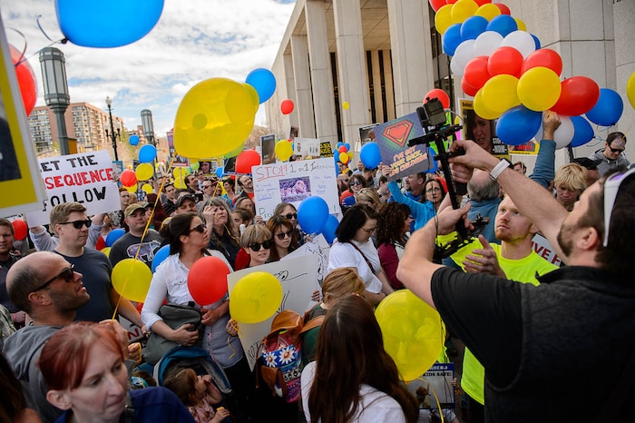 Marissa Smith pushed her 18-month-old son, Claine, in a stroller during the march. Babies cooed during the speeches and toddlers blew bubbles on the sidewalk. The next generation, the protesters said, shouldn’t be having these conversations.