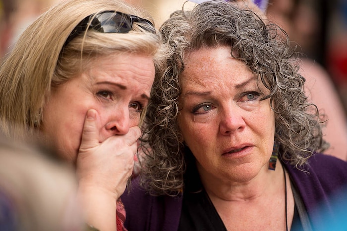 People, including members of the Mormon Church, held a rally and marched to the LDS Church Office Building in Salt Lake City to request that the faith's leaders put an end to bishops meeting one-on-one with children for interviews. Friday March 30, 2018. Laurie Shipp and Jody England Hansen listen to a speaker.