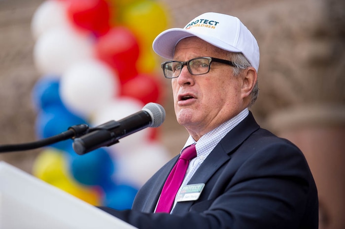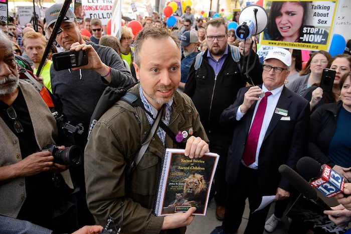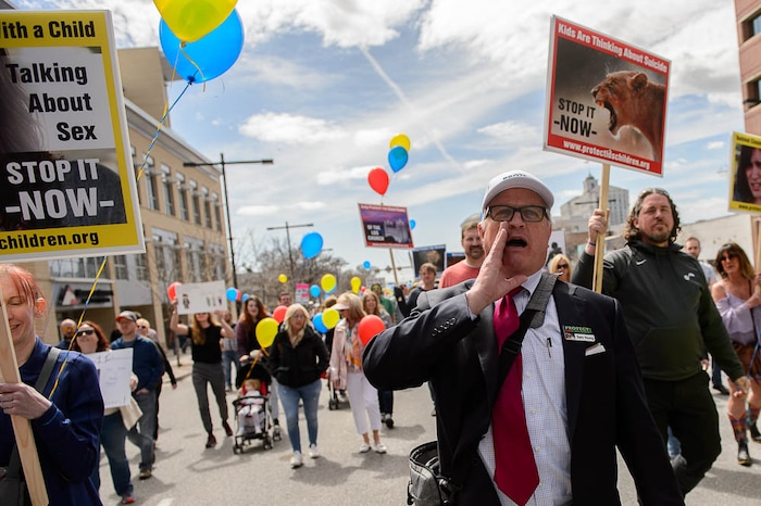 People, including members of the Mormon Church, held a rally and marched to the LDS Church Office Building in Salt Lake City to request that the faith's leaders put an end to bishops meeting one-on-one with children for interviews. Friday March 30, 2018. Sam Young at left.