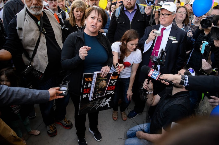 People, including members of the Mormon Church, held a rally and marched to the LDS Church Office Building in Salt Lake City to request that the faith's leaders put an end to bishops meeting one-on-one with children for interviews. Friday March 30, 2018. Sam Young speaks with LDS Church representative Irene Caso.