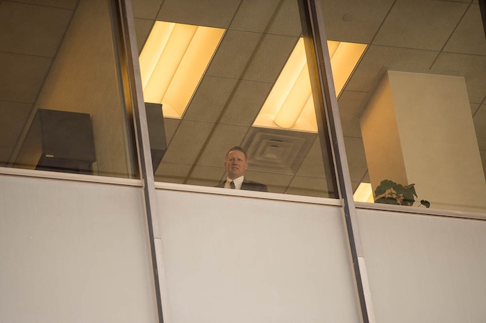 People, including members of the Mormon Church, held a rally and marched to the LDS Church Office Building in Salt Lake City to request that the faith's leaders put an end to bishops meeting one-on-one with children for interviews. Friday March 30, 2018. A man inside the Church Office Building looks out on the rally.