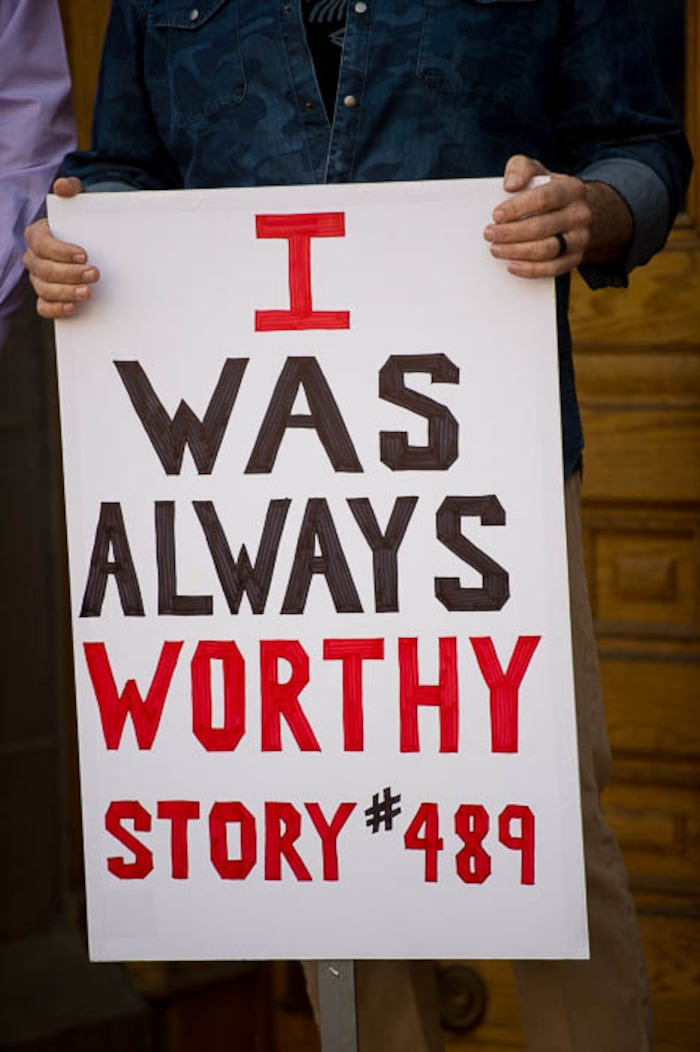 People, including members of the Mormon Church, held a rally and marched to the LDS Church Office Building in Salt Lake City to request that the faith's leaders put an end to bishops meeting one-on-one with children for interviews. Friday March 30, 2018. Tammy Ellis holds a sign.