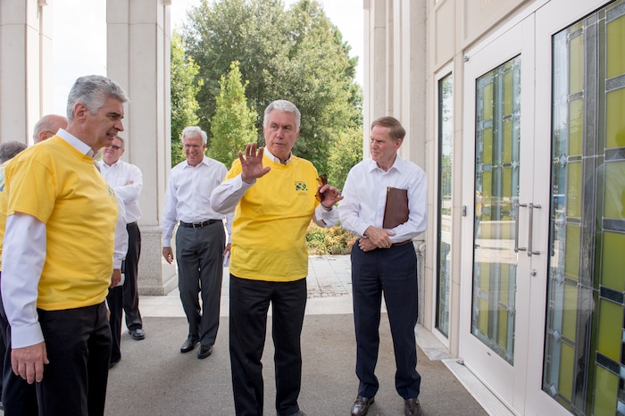 (Rachel Molenda | The Salt Lake Tribune) President Dieter F. Uchtdorf, center, visits the Houston Temple on Sunday, Sept. 3, 2017, along with Presiding Bishop Gérald Caussé, left, and Houston Temple President Marshall Hayes, right.
