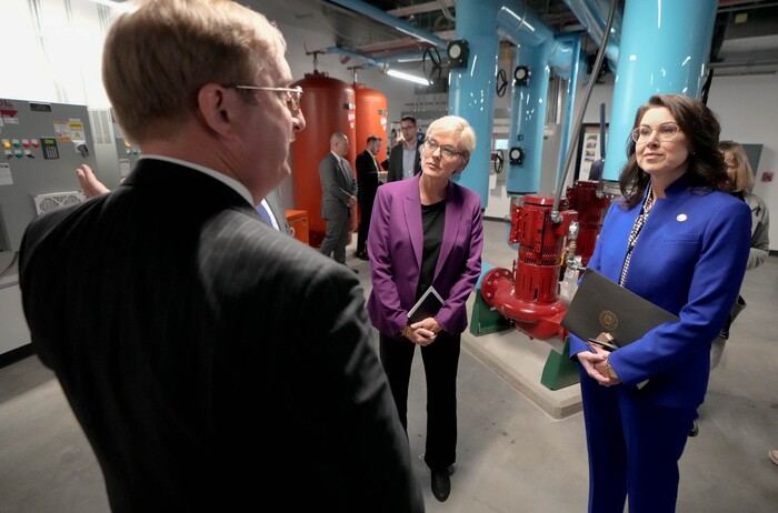 Granholm also toured the geothermal plant inside the U.’s Gardner Commons building. Completed in 2018, Gardner Commons is energy independent. To do that, the university drilled 150 wells down to 350 feet under a soccer stadium near the building