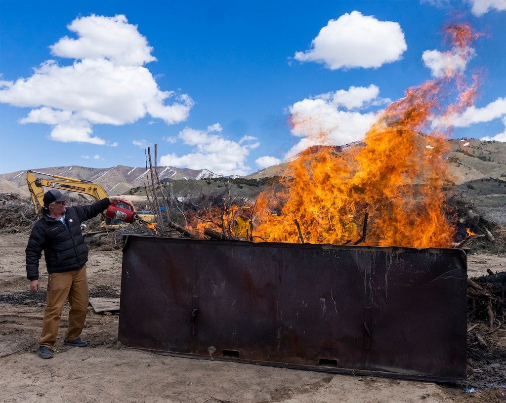 (Rick Egan | The Salt Lake Tribune) Firefighters from Lone Peak District set up the Wilson Biochar Ring of Fire at the Tooele County Landfill, on Wednesday, April 19, 2023.