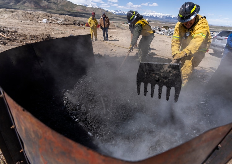 (Rick Egan | The Salt Lake Tribune) Firefighters sift through biochar from the "Ring of Fire" kiln at the Tooele County Landfill on Wednesday, April 19, 2023.