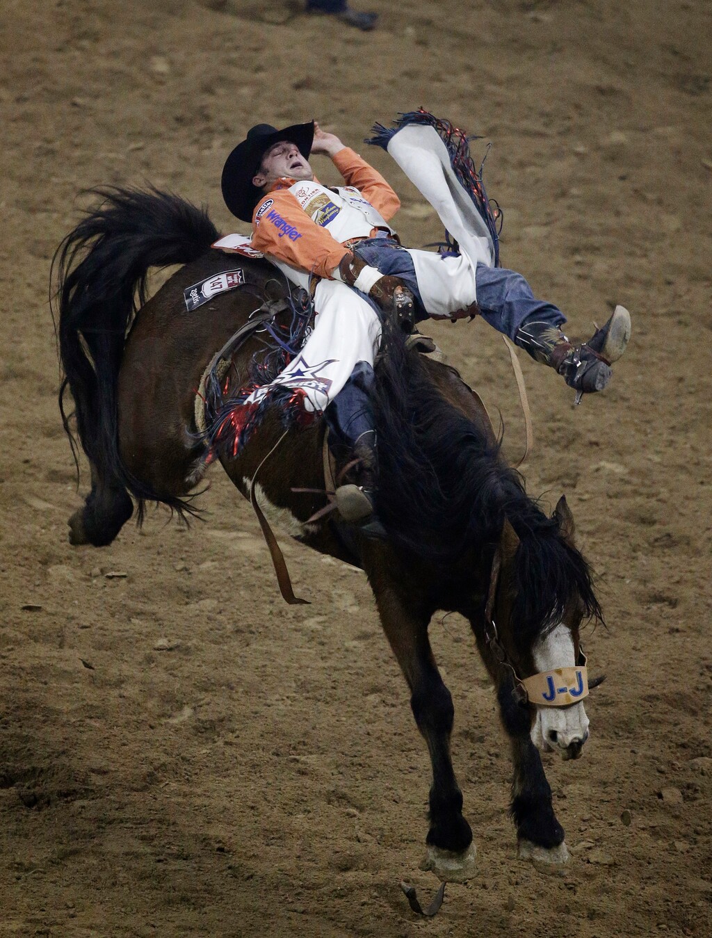 Bareback rider Kaycee Feild from Spanish Fork, Utah, rides Pete Carr's Classic Pro Rodeo's Scarlet's Web to a second place score of 86 during the tenth go-round of the National Finals Rodeo at the Thomas & Mack Center in Las Vegas, Saturday, Dec. 13, 2014. (AP Photo/Las Vegas Review Journal, Josh Holmberg)