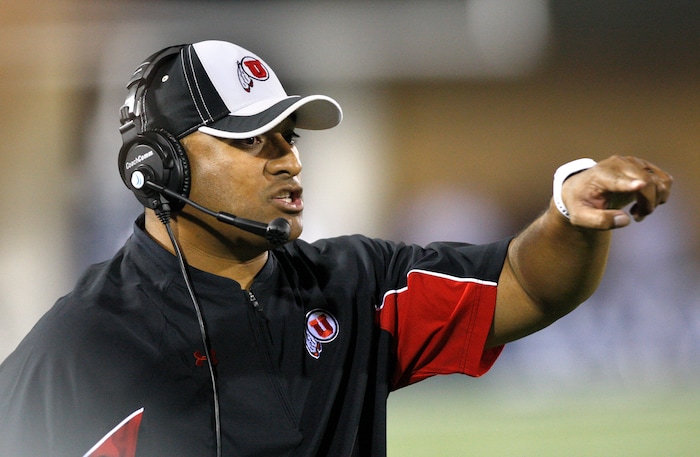 Defense coach Kalani Fifita Sitake during the University of Utah's 27-20 overtime win against Utah State University, Friday, Sept. 7, 2012 in Logan, Utah.