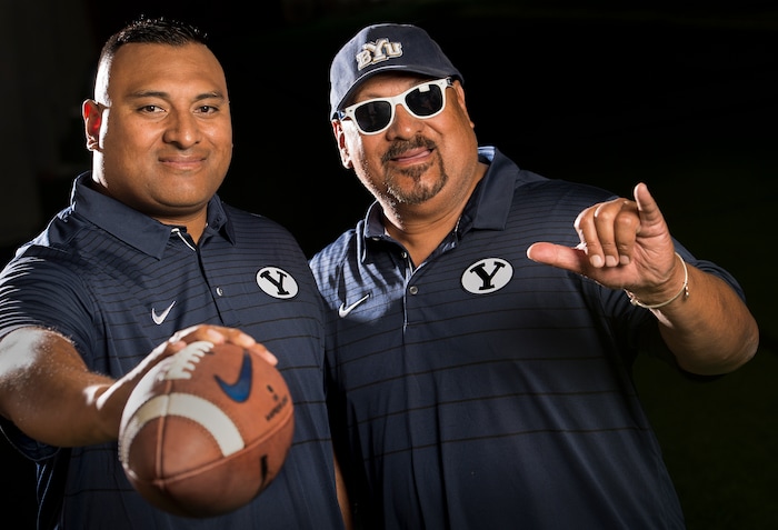 (Leah Hogsten | The Salt Lake Tribune) Brigham Young University head coach Kalani Sitake and his father Tom Sitake, Wednesday, August 2, 2017 during BYU's annual football photo day in the Indoor Practice Facility (IPF) on campus.